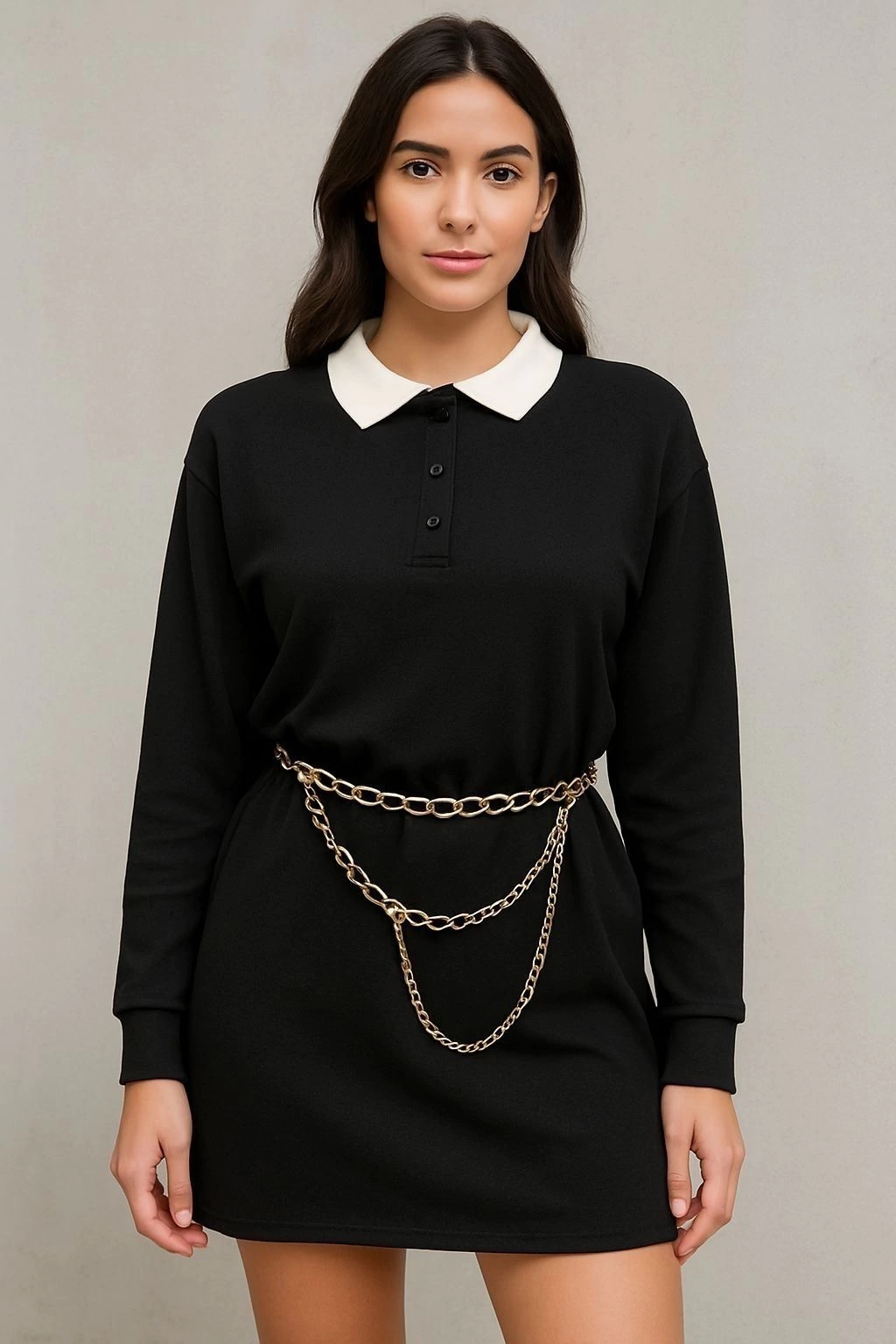 Esse conjunto é a escolha perfeita para quem busca um look moderno com um toque de elegância. Com design minimalista, ele conta com um vestido tipo camisa de manga longa em tecido macio e confortável, ideal para diversas ocasiões. A gola polo em tom contrastante branco adiciona sofisticação ao visual. O destaque fica por conta do cinto de corrente dourada, que valoriza a silhueta e confere um charme extra ao modelo. Disponível em várias cores para combinar com o seu estilo.