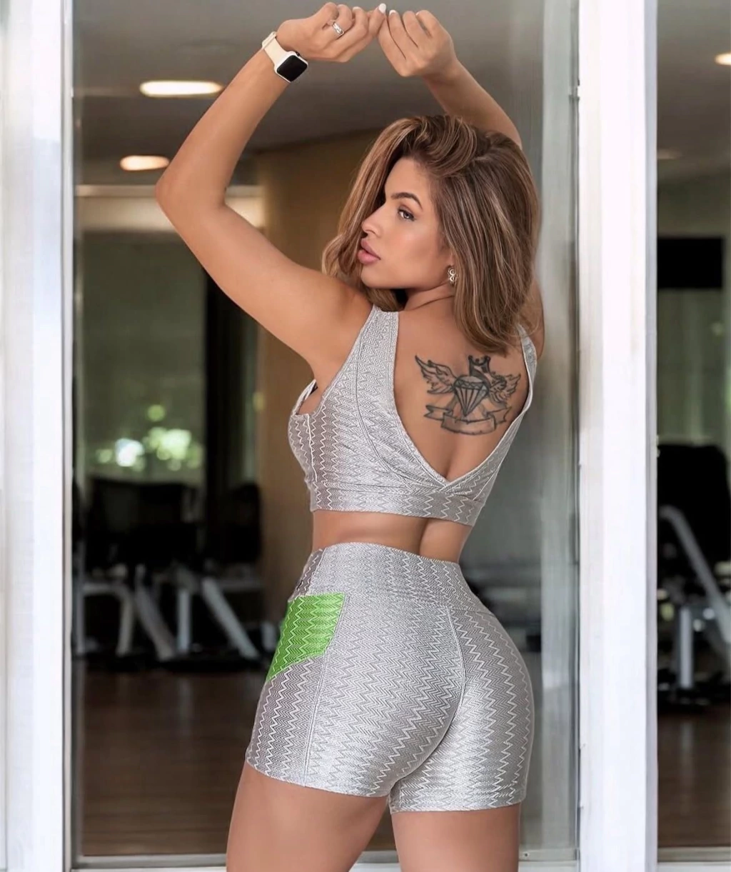CONJUNTO FITNESS CLARICE – Seu treino nunca foi tão confortável e estiloso! Feito com tecido poliamida que abraça seu corpo como um abraço de urso (só que mais leve!), este conjunto é perfeito para quem quer arrasar na academia. E o melhor? Possui bojo para aquele suporte que você merece, mesmo pulando como pipoca! Não perca tempo, sinta-se linda, segura e pronta para suar com muito charme! 😍💪