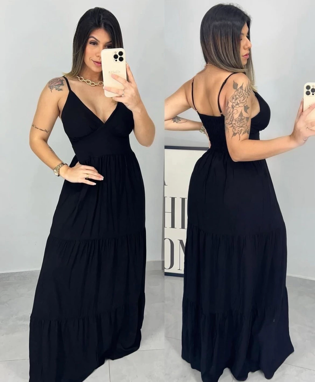 Sinta a delicadeza e o charme deste vestido longo com alças finas, perfeito para ocasiões especiais ou um passeio elegante. Confeccionado em tecido leve, que proporciona conforto e frescor durante todo o dia.